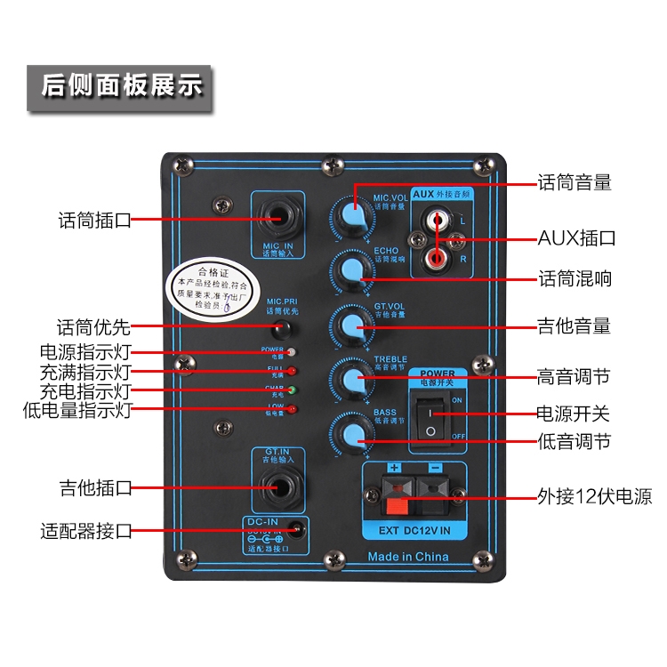 ■內建USB、AUX、TF卡輸入及FM廣播,可插入USB隨身碟讀取MP3音樂及外接各項音源,液晶螢幕顯示FM廣播,並能儲存多個電台
